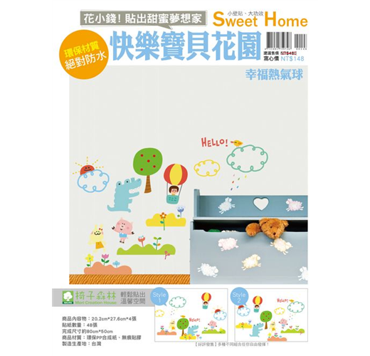 營造創意居家氛圍,讓生活不再枯燥乏味。造型超可愛的「快樂寶貝花園」壁貼,兩款造型《幸福熱氣球》款、《我愛大象》款,任您發揮創意,可變化出不同組合,讓家長們不用再傷腦筋,如何為家中寶貝布置房間。温馨的色彩、搭配可愛的卡通動物,貼在兒童房或是家中合適的角落,趣味歡樂氣氛將陪伴小朋友們度過最快樂的童年生活!