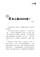 4年漲了40000倍,唯有比特幣!不管你是金融專家或是一般民眾,不管你投不投資,你都不能忽視比特幣的存在。本書是中國大陸第一本系統介紹比特幣的普及性讀物,主要內容包括以下六大章:「什麼是比特幣」、「怎樣得到比特幣」、「比特幣對我有什麼用」、「如何投資或投機比特幣」、「比特幣投資的風險在哪」、「比特幣的未來前景如何」。每節均附有一則有關比特幣投資的「拓展閱讀」,以增強可讀性、豐富知識性。本書無論是對比特幣一無所知的門外漢還是專業投資者,都能提供幫助,讓讀者能立即瞭解並抓住這百年不遇的投資良機!傳統貨幣最根本的問題在於信任。央行必須讓人信任它不會讓貨幣貶值,但歷史上貨幣貶值的事情一再發生。銀行本應該幫我們保管錢財並以電子化形式流通,但是他們卻讓財富在一輪輪的信用泡沫中浮沉。——比特幣創始人 中本聰比特幣已經創立了自己的私人金本位世界,其中貨幣供應是固定的,不受貨幣印刷量增加的影響。那麼,情況怎麼樣?網路貨幣的價值劇烈震盪,但總體呈大幅上升趨勢。因此,至少到現在為止,買入比特幣是一樁不錯的投資。——諾貝爾經濟學獎得主 保羅•克魯格曼很多人相信,比特幣將引發繼資訊革命之後的第四次產業革命——金融革命。很多人相信,比特幣必將改變金融業,就像當年互聯網改變了傳媒業那樣。——比特幣交易平臺創始人 張沈鵬即使比特幣未來崩潰,它也會為整個金融行業留下不朽的遺產,推動新的數位貨幣的發展。——英國《經濟學人》雜誌本書特色★ 貨幣之王比特幣,四年能賺4萬倍★ 歷史上每隔10年就有一次巨富機會:2014年,輪到比特幣!★ 第一本比特幣專書,解析金融界不容忽視的奇異現象「比特幣」★ 涵蓋比特幣的由來背景、流通、投資、風險、未來趨勢,全面揭露比特幣狂掃全球的神奇魔力!