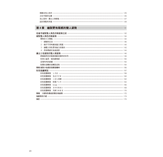 第3章是雙人插畫的實踐篇,將一個人構成的姿勢應用在兩個角色的插畫上,並且介紹了繪製雙人插畫的步驟。