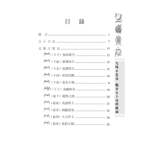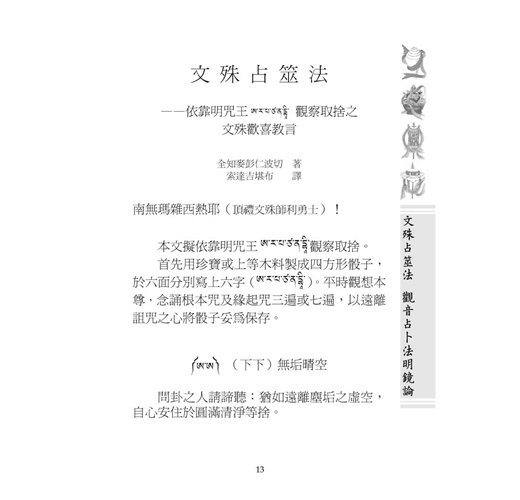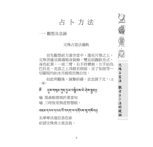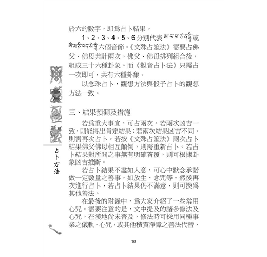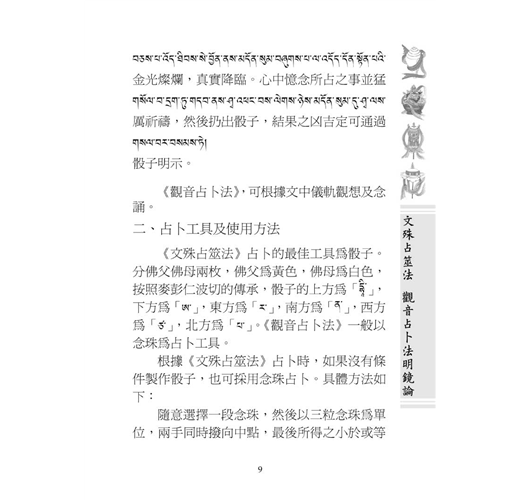 西藏占卜術有悠久的歷史,留下了浩如煙海的著作,大可分為三種門派:一種是民間傳統的卜卦方式、一種是苯波教的占卜方式、還有一種則是佛教的占卜方式:即諸佛菩薩化身的成就者們因悲湣眾生,而以對世間種種因緣洞若觀火的無漏智慧、出世間的無礙神通,洞悉世人所不能觀察的種種因緣,所賜予的金剛語。我們揭示了因果之間的諸多奧妙,實乃度化眾生不可多得的善巧方便。而其中被公認為最具權威,而且流傳最廣的,當屬麥彭仁波切的《文殊占卜法》語法王松贊干布的《觀音占卜法》。此兩種占卜法無須傳承,簡便易行,只要發心清淨,對三寶有至誠的信心,就會得到明確的宣示,為我們判斷事態、取捨行止提供有力的參考依據。