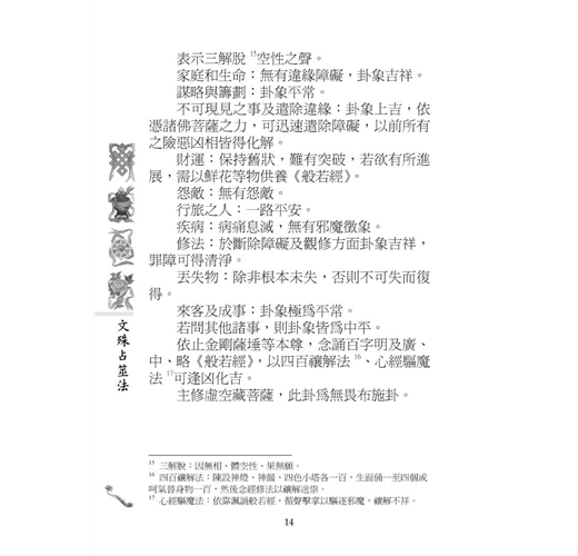 坊間諸多占卜法往往提供的事一個鐵定的結局,如果占卜結果不利也難有逆轉之力,無法改變當事人的窘況。而本書介紹這兩種占卜法不僅有預測之功效,也為我們提供了化解之良方。即並非讓卜卦者消極地聽天由命,任憑命運的宰割,而是以各種積極的方式臨機應變,製造及改變因緣,以達到避凶趨吉的目的。所以,有必要將之推薦。