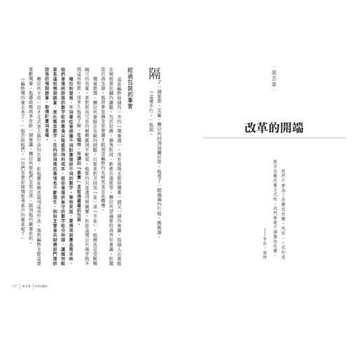 ◎在改革初期,有些福特老臣高高在上,美其名負責組織大方向規劃,實則根本不清楚所屬單位的細節。穆拉利以身作則,對各單位瑣碎的細節瞭若指掌,遠比負責的高階主管還清楚。