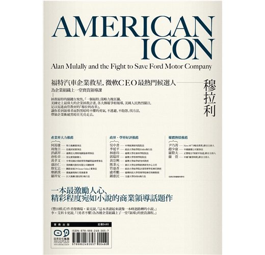 「在世界日益競爭的環境下,幾十年來我們聽過無數傳統產業結束營業的例子,看到福特汽車重返榮耀的過程真的十分鼓舞人心。布萊斯‧霍夫曼描述艾倫‧穆拉利帶領福特走出低潮的故事更是引人入勝。我可以說這本絕對是年度商管好書。」