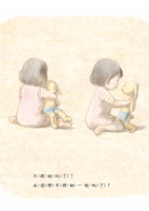 熟悉的事物能為幼兒帶來安全感,這本書重複性的文字敘述,符合幼兒喜歡可預期、可掌握事物的特性,也帶來節奏感與穩定的力量。文字於重複中,又在小女孩與友伴搶玩具該段落做了變化,帶來小小的起伏、高潮。