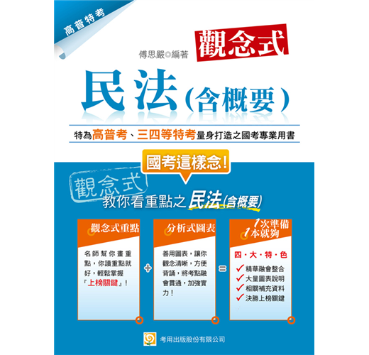 本書從學習者的角度出發,不論艱深的各家學說之爭辯,而以考普特考的命題方向,彙整民法一科之重點,以簡明易懂的方式呈現,幫助讀者記憶重點。書末附上名詞引索,