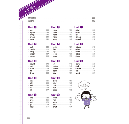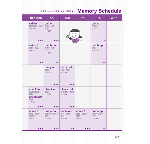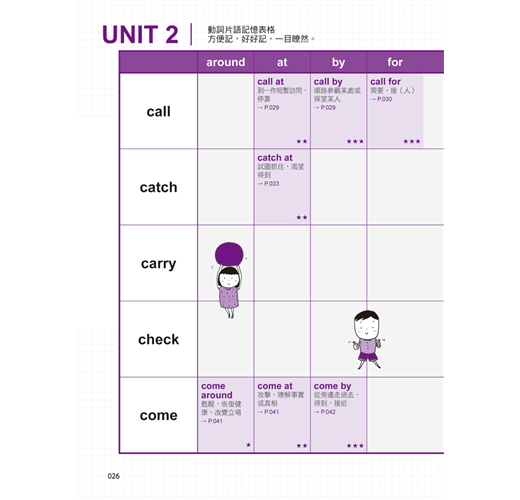 本書分為13個單元,每個單元精心製作「動詞片語記憶表格」,並依使用頻率與重要性依星號標示,無論是要掌握學習進度或是要做重點統整,清楚的表格呈現方式讓讀者一目瞭然,輕鬆查找。