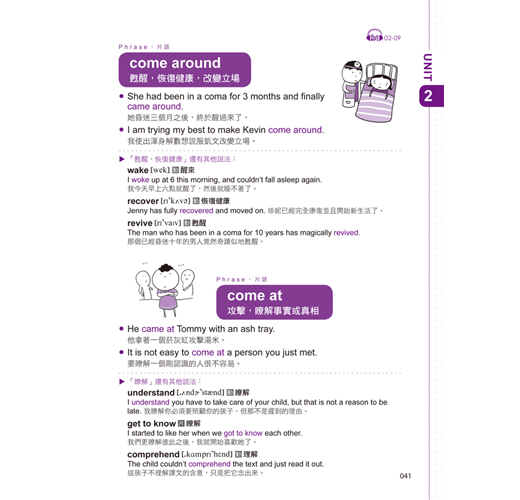 詳細解釋每則動詞片語,每個動詞片語列舉二種以上的例句,並搭配插圖,輔助學習、加強記憶,讓讀者在不知不覺之中就把動詞片語記起來。