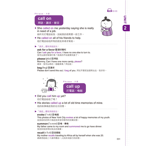 每個單元搭配大情境圖幫助單字記憶,小圖輔助記憶動詞片語,充分利用人類的左右腦特性,最適合忙碌的現代人,結合情境與圖像記憶,不用死背也能輕鬆記牢。