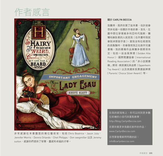 具有作家與插畫家身份的CARLYN BECCIA,其知名作品包括了《Who Put the B in the Ballyhoo?》、《The Raucous Royals》以及《I Feel Better with a Frog in My Throat》等等。她有好幾冊兒童繪本書,分別獲得了像是金風箏獎(Golden Kite Honor)、國際閱讀協會(International Reading Association)的「年度非小說類書籍」獎項(Nonfiction Book of the Year)、奧朋漢玩具金獎(Oppenheim Toy Award)以及美國家長票選銀牌獎(Parents' Choice Silver Award)等幾個大獎的肯定。目前除了教授兒童與成人的數位彩繪課程之外,她還在歷史題材部落格www.raucousroyals.com擔任主筆,並主持http://blog.carlynbeccia.com這個繪畫教學部落格。