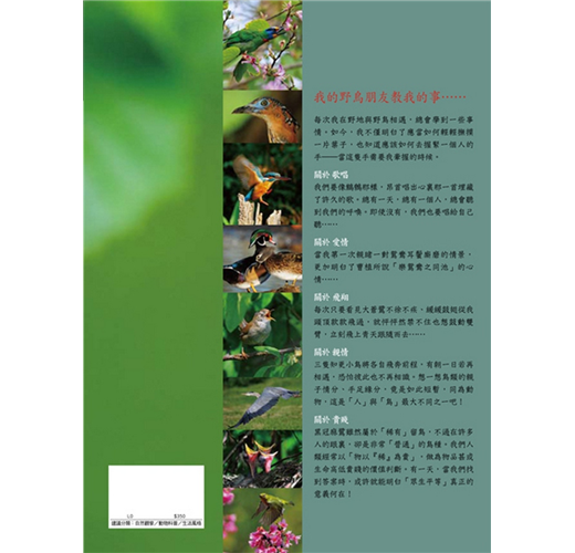 作者愛鳥,把野鳥當作朋友。在野外遇見朋友,和朋友將心比心,關心自己也關心朋友。倘若我們不能「愛屋及鳥」,是不是也可以換個角度來「愛鳥及屋」?大家一起來愛鳥,交換不同的愛鳥心得,結交野鳥朋友,集合朋友一起來鞭策、改善環境,使人與鳥都可以安適而生存。