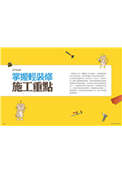 STEP 1了解各屋況輕裝修裝修要訣→STEP 2掌握輕裝修施工重點→STEP 3聰明規劃預算→STEP 4不可忽略的基礎工程→STEP 5不大興土木達到裝修效果→STEP 6營造到位的居家風格