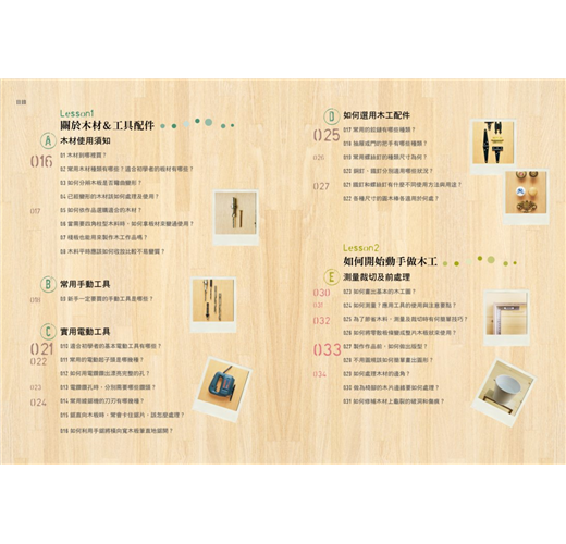 木工沒有你想像的那麼難!做得好的訣竅就在小細節。本書是初學者的最佳入門參考書。作者是擁有十多年教學經驗的資深木工達人,從課堂中整理出學生最常問到、最實際好用的技巧疑難Q&A,從認識材料、正確使用工具開始,到實際製作時不可欠缺的木作知識、提升作品質感的塗裝技巧等,書中皆分門別類、一一詳細說明。