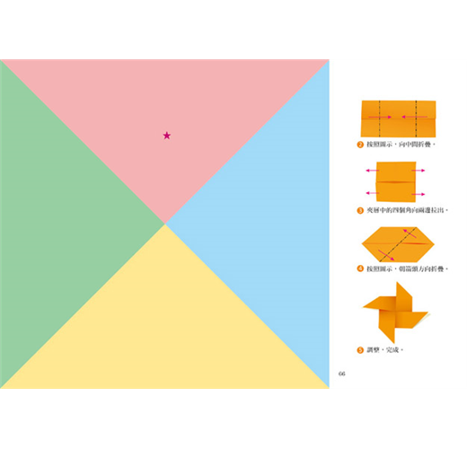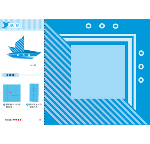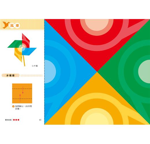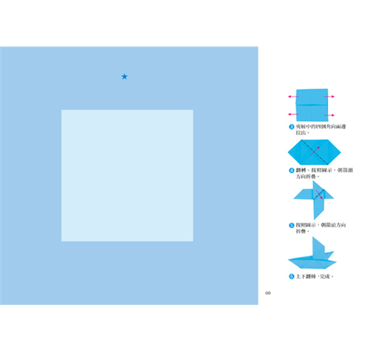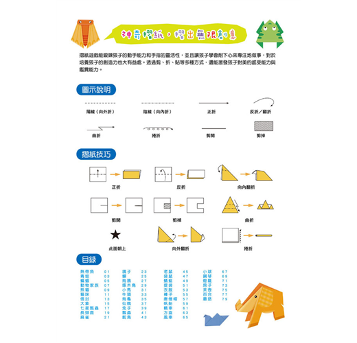 書中的每個摺疊步驟說明都非常簡明扼要,孩子可以獨力完成,稍微具難度的,也可以在父母的陪同下進行。掌握摺疊的規律之後,也可以自己創造出新的造型哦!
