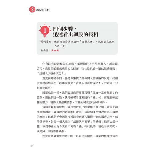 投資股票最重要的是,能一眼看出其價值。專業的機構投資者幾乎都練就憑直覺看出股票「漲」相的本領──我這麼說絕對沒有誇大其實,事實上,這種直覺不是一朝一夕速成,而是經過大量的個股研究磨練出來的,而本書就是要培養你,一眼就看出飆股長相的實力。