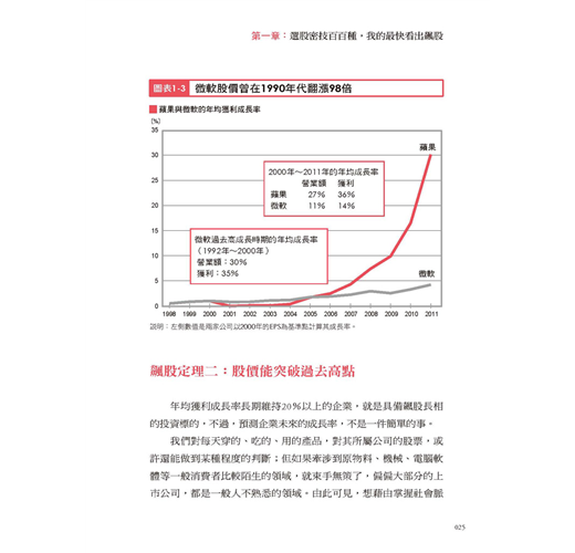 「1990年代的超級大飆股是微軟,之後由蘋果接棒。」這個事實對大家來說或許並不新鮮,但我相信有很多人看到這裡,才知道飆股的股價竟然可以飆漲近百倍,等於拿1萬元投資,可以拿回100萬元!