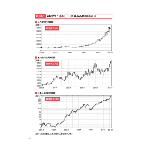 舉例來說,靠著Wii席捲全球的遊戲機製造商任天堂,它的股價從2003年的谷底到2007年的高點,總共翻漲了9倍。至於以優衣庫(UNIQLO)品牌聞名全球的迅銷公司,其股價從2002年到2012年,也總共翻漲了8倍。