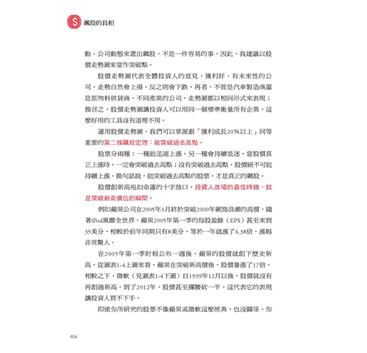 此外,隨手舉幾個作者在書中所說的原則,例如「平穩期愈長,股價漲幅愈大」、「買在突破近期新高價的位置」等,其實正是作者對產業基本面與技術面的相互印證。平穩期長,代表的是產業進行供需及體質的調整,而選擇買在突破近期新高價的時機點,則讓大部分無法長期等待的投資人,可以在股票起漲前,在最適當的時機出手,以獲取最大的報酬。