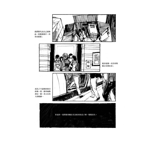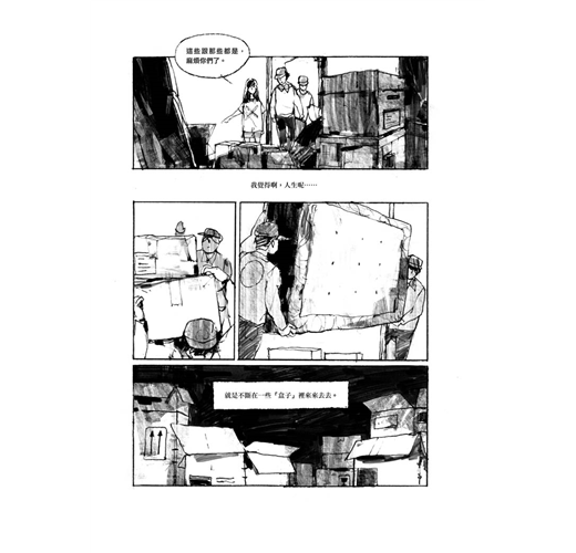 人生呢……就是不斷在一些「盒子」裡來來去去;我們將代表自已的物品,放進紙箱中,再拿出紙箱;進出電梯,在住所與辦公室間往來;或從一節車箱換到另節….但最終,我們都會躺在盒子裡,慢慢消失。