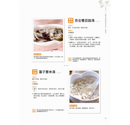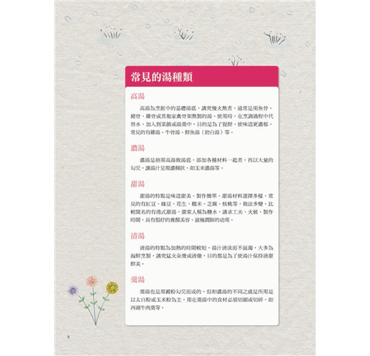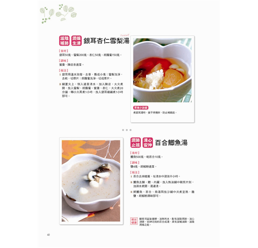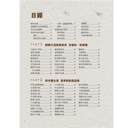這裡的湯品有甜的有鹹的,不分男女老少都可以滋補養生,這裡詳細介紹操作步驟,以及關於烹煮小訣竅,並告訴你食材怎麼煮才會喝出健康,讓你輕鬆做出滋味和外觀俱佳的好湯。