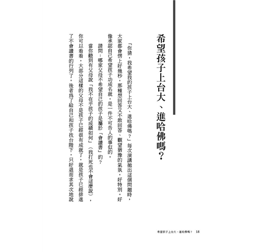 「你猜,我希望我的孩子上台大、進哈佛嗎?」每次演講拋出這個問題時,大家都會愣上好幾秒,那種想回答又不敢回答、觀望猶豫的氣氛,好特別。好像承認自己希望孩子功成名就,是一件不可告人的事似的。