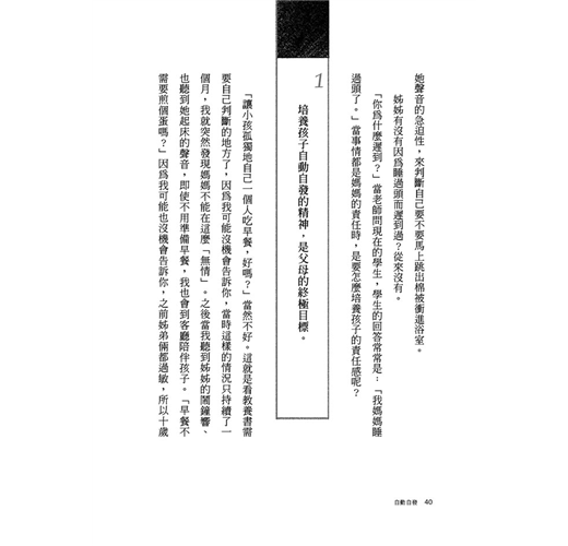 每次都只說一件事。從你愛他開始說起,從他們小時候的愉快時光說起,最後再說你想說的道理。這道理,不是批評孩子的話,是放諸四海皆準的真理,例如,做學生的,要用功讀書;例如,打電動不可以佔據休息時間的全部;例如,人生除了玩樂,還要工作,這樣才會有真正的快樂。