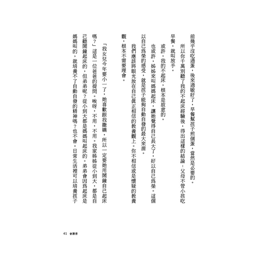 鋪路,也是有先後順序的。我希望孩子成績好,但我不能超之過及。當小孩的年齡還需要從玩樂中學習時,我就不能填鴨;當小孩還需要大量跑跑跳跳的時候,我就不能老將小孩往補習班送。有些事情看不到短期效果,但卻有長遠的影響力,例如,多幫小孩唸故事書,我就必須先說《餵故事書長大的孩子》。有些事情有急迫性,例如,人格養成,我就必須先說《管教啊,管教》。有些事情關係一輩子的幸福,例如,親子關係,我就必須先說《孩子知道你愛他嗎》……