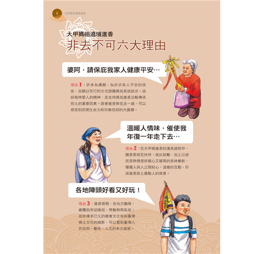 詳實的標題主題,搭配簡明的文字,匯集古今史地相關知識,清楚介紹大甲媽祖遶境進香的發展源流、舉行時間及空間、核心價值、重要儀式行為(例如:大甲媽祖信仰的歷史典故、重要民俗文物的名稱與內容、遶境進香成員角色與職責、進香工作人員與信徒的感人故事與事蹟、參與體驗的方法與須知等等)。