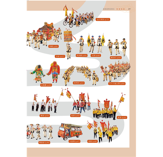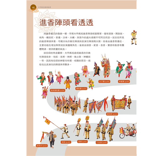 以簡明易懂的圖解,將許多文字難以表達、一般民眾難見未見的民俗事物(例如長達數百公尺、讓人眼花撩亂的大甲媽祖遶境隊伍,遶境進香神轎的外觀與內觀),透過豐富精采的照片與精細生動的插畫,讓人一目了然、印象深刻,輕鬆認識民俗文化的風貌。