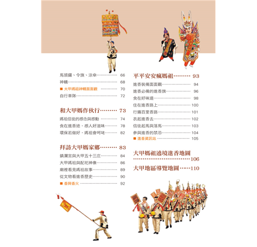 介紹大甲媽祖遶境進香路線、以及參與進香的行前須知,同時也以地圖引導讀者探尋大甲地方觀光資源(文化景觀、地方美食、伴手禮等);本書採用輕薄短小的25開版本,適合隨身攜帶、隨時查閱,是社會大眾、學校師生或家長親子參與、體驗媽祖民俗文化的最佳導覽和指南。