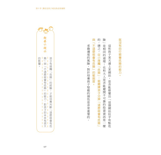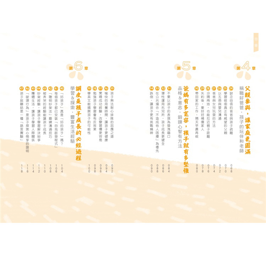 世界在變,教養理念也該改變,本書告訴你,拋開「父母應有的樣子」的傳統包袱,用更正面積極、多元的角度,看待生活中的負面情形,才是更適當的教養態度。全書以簡潔、輕鬆的方式,探討家庭中各類瑣碎又讓人不知所措的問題:夫妻吵架態度、孩子說謊、搗蛋、無節制花費零用錢等行為……一一破解教養迷思,引導父母拿捏分寸,在過與不及間,尋求從容的方式,讓孩子不與世隔離,卻又能獲得完整的保護並健全成長。