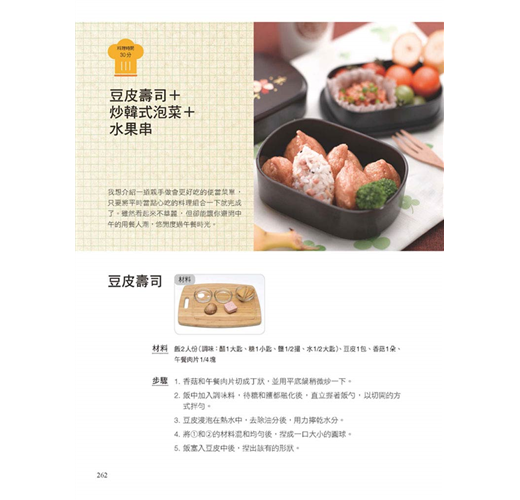 咖哩飯/日式牛肉燴飯/小黃瓜壽司/韓式泡菜豆腐壽司/熱狗壽司/牛丼/小魚乾一口飯糰/辣味涼拌牡蠣拌飯/高麗菜包飯佐堅果豆瓣醬/韓式泡菜炒飯