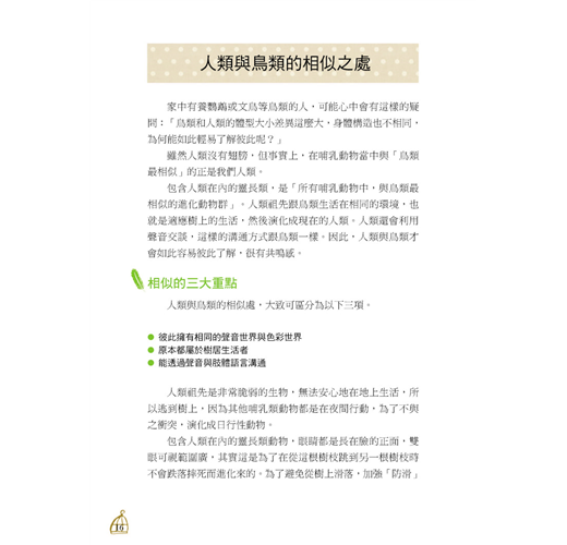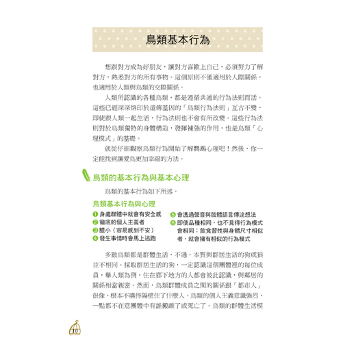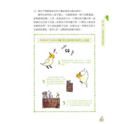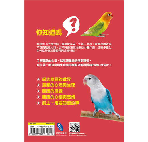 本書以心理學與行為學的角度,清楚明瞭的解釋鳥兒們內心的想法,並作為適合你家鸚鵡的飼養方式的參考基礎。無論是飼養哪一類鸚鵡的飼主,都能從中得到各種疑問的解決方法。