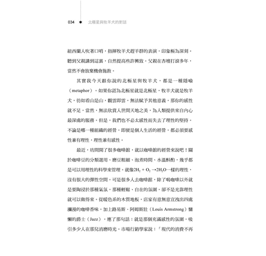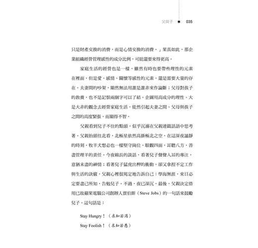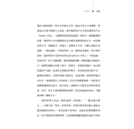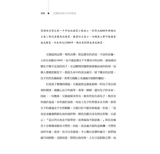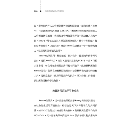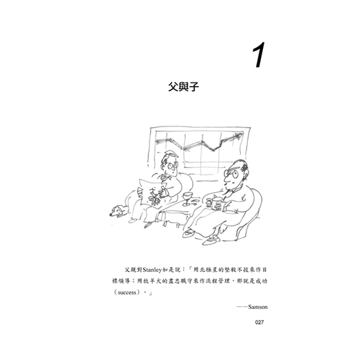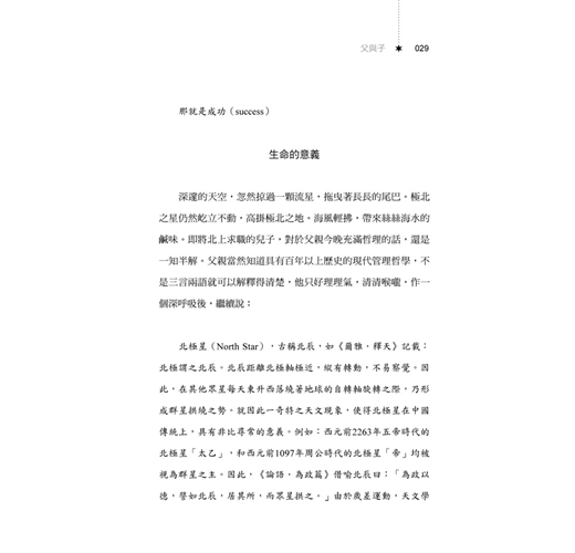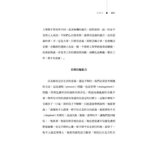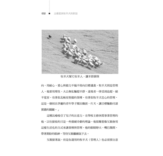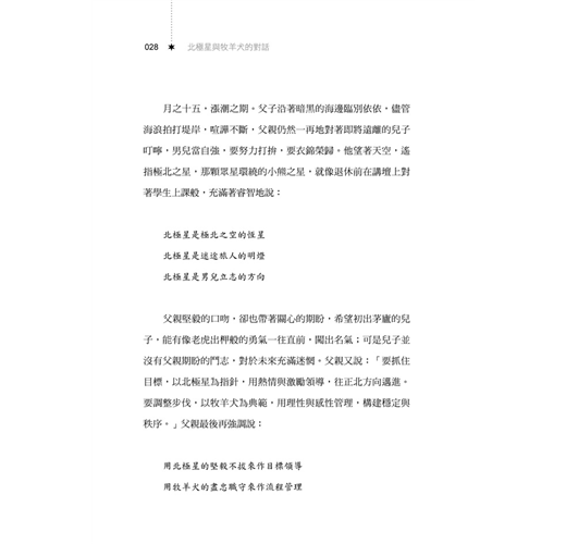 現在北極星與牧羊犬即將進行對話,為了方便你的閱讀,再度提醒你關掉手機與電腦,用100%的心力觀看這場父與子的對話。記得,書中的父親是作者,Stanley是兒子。為求故事情節活潑及場景變化起見,文中或以「父親」、「父親說」為開頭,讀者可以想像自己是坐在舞台下的聽眾,正在旁觀父親平鋪直敘地說出親身故事或所體會的人生哲理;或又以Stanley為開頭,直呼兒子的名字,其實這是作為父親對兒子殷切期望的耳提面命,讀者如能把握此一閱讀要領,當能充分瞭解書中最想傳達的人生哲理或領導管理之精華觀點。