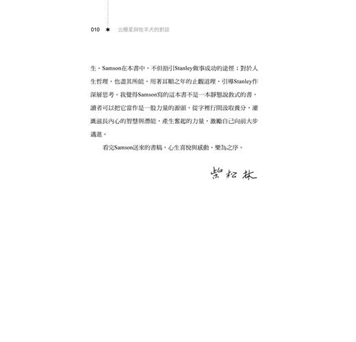 我非常高興得知你正在撰寫一本《北極星與牧羊犬的對話》新書。我相信,這本書將有助於建立人與人之間的熱情和善意。不管人們在日常生活中遇到什麼困難經驗,我們應該相信自我,這種自信也有助於實現我們的人生目標。我相信這本書可以建立讀者的情誼,以及幫助讀者發展個人在公共與私人生活領域的人際關係。