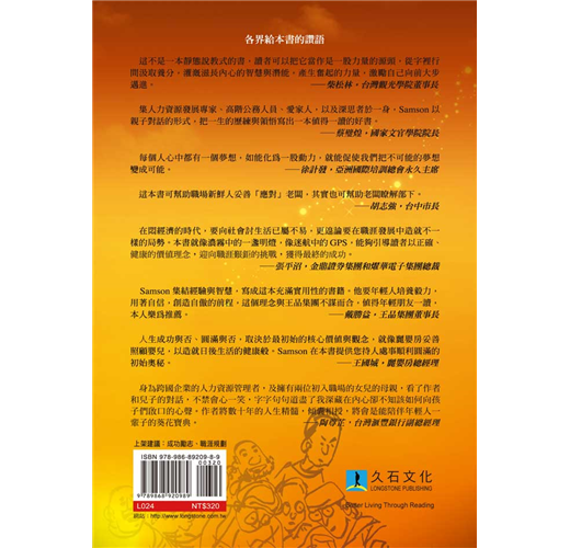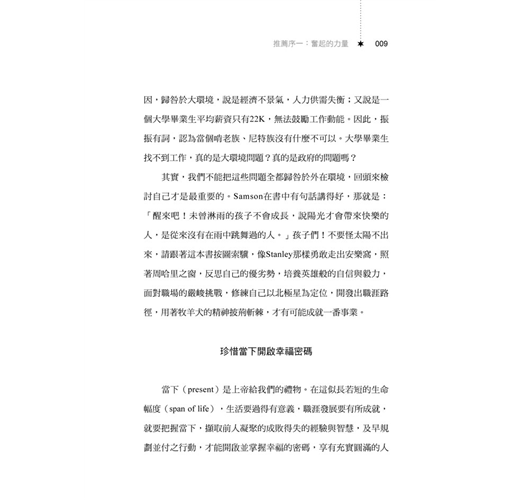當下(present)是上帝給我們的禮物。在這似長若短的生命幅度(span of life),生活要過得有意義,職涯發展要有所成就,就要把握當下,擷取前人凝聚的成敗得失的經驗與智慧,及早規劃並付之行動,才能開啟並掌握幸福的密碼,享有充實圓滿的人生。Samson在本書中,不但指引Stanley做事成功的途徑;對於人生哲理,也盡其所能,用著耳順之年的止觀道理,引導Stanley作深層思考。我覺得Samson寫的這本書不是一本靜態說教式的書,讀者可以把它當作是一股力量的源頭,從字裡行間汲取養分,灌溉滋長內心的智慧與潛能,產生奮起的力量,激勵自己向前大步邁進。
