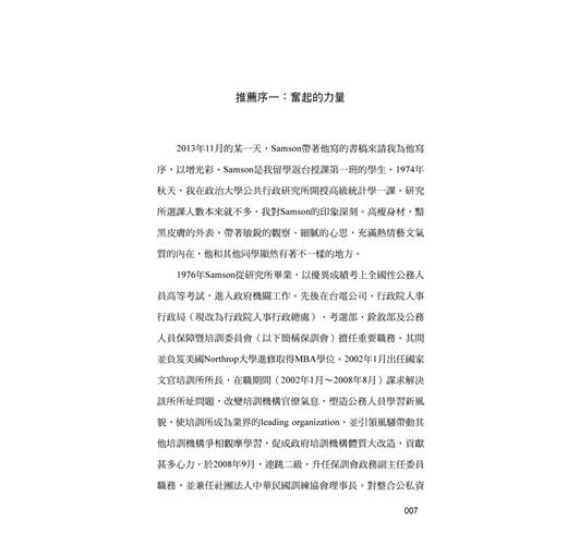 2013年11月的某一天,Samson帶著他寫的書稿來請我為他寫序,以增光彩。Samson是我留學返台授課第一班的學生。1974年秋天,我在政治大學公共行政研究所開授高級統計學一課。研究所選課人數本來就不多,我對Samson的印象深刻。高瘦身材,黯黑皮膚的外表,帶著敏銳的觀察、細膩的心思,充滿熱情藝文氣質的內在,他和其他同學顯然有著不一樣的地方。