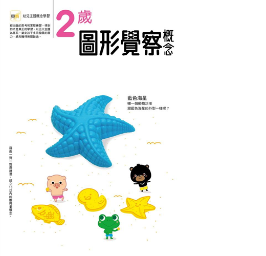 圖形概念包含了:基本平面圖形、基本立體圖形、空間位置、圖案組成等。此套練習本適齡、多元的設計了圖形辨識、配對、組合等,與圖形概念相關的題型,讓孩子經由練習、思考過程中,逐漸建立由具體→抽象;立體→平面的圖形思維能力。