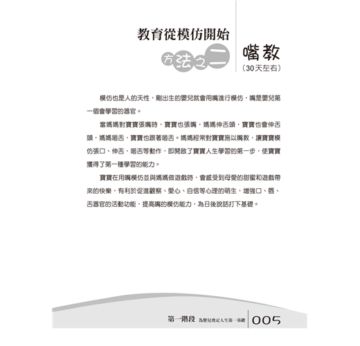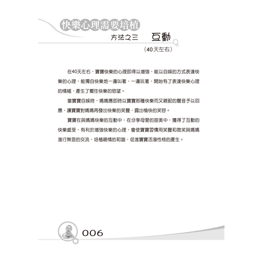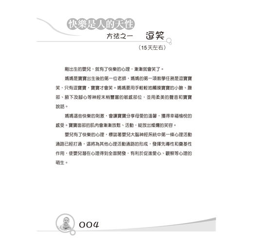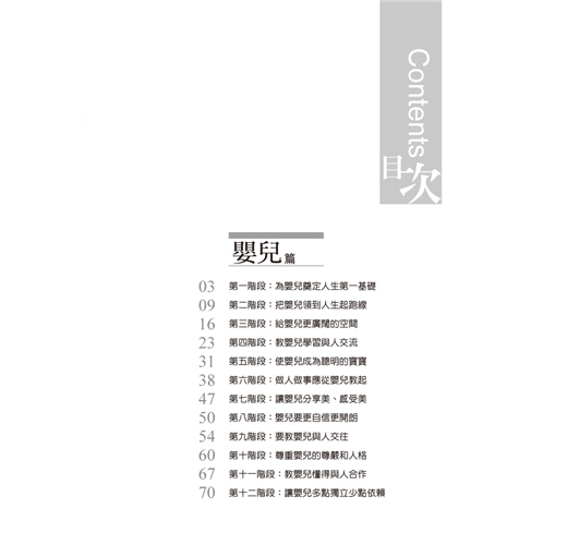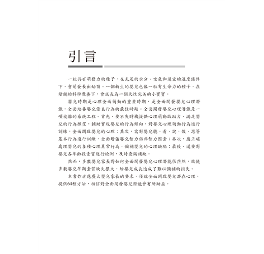 專家根據嬰幼兒心理發展的規律與特點,教導父母對嬰兒基本行為進行訓練,全面開發嬰兒的心理潛能;教幼兒重複做正確的事情,促進幼兒的心理全面發展,是一本新手父母不可缺少的育兒寶典。