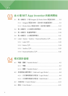 MIT App Inventor的相關功能都有介紹,包括:程式邏輯所需的拼圖塊、各種不同用途的元件(User Interface元件、Layout元件、Media元件、Drawing and Animation元件、Sensors元件、Social元件、Storage元件、connectivity元件),但不含LEGOR MINDSTORMSR (控制樂高機器人)元件。