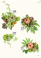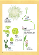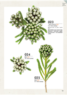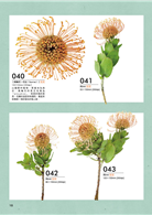 本書作者十分用心,收集了非常多我們日常生活中鮮少看過的異國熱帶植物,書內的植物將會顛覆你對於植物的既有印象,因為氣候特殊,每株花草都演化出了自己的特色,花朵再也不是粉紅色的五片花瓣,葉子也不再長得薄薄一片橢圓。第一章前半部份收錄了各種多肉植物,肥厚圓潤的葉片配上泛著光澤的鮮綠色,看著就有療癒人心的作用,在設計好的作品角落放上一兩株多肉植物,能夠營造出詳和的氛圍。而後半部收錄的是熱帶地區色彩繽紛的花朵以及外觀非常獨特的植物,例如來自南非的「風輪花」,有著茂密的細長花瓣,看起來就像無數根針插在針插上;還有原產於德國的「星之球」,許多小花組成一顆宛如繡球花的圓球,每一朵小花就像一顆星星,因為是透著粉紅的淡黃色,不論搭配色彩明亮或色調柔和的設計都能夠融入整體。除此之外還有枝葉都極度細長,整株植物看起來像蜘蛛腳的「Seastar」、葉片厚實,綠中透紅的「海神花葉」、巨大艷麗的南非國花「帝王花」、花朵看起來彷彿一顆球藻的「Pocoloco」、葉脈四周自然形成棕色斑紋的「尖蕊秋海棠」、以及果實小巧茂密,常被使用於裝飾花束的「Brunia」和「Berzelia」,獨一無二的造型既能襯托畫面的重點,也能抓住觀看者的目光,這本滿溢著異國情調的素材集絕對會讓人感到驚豔無比、耳目一新!