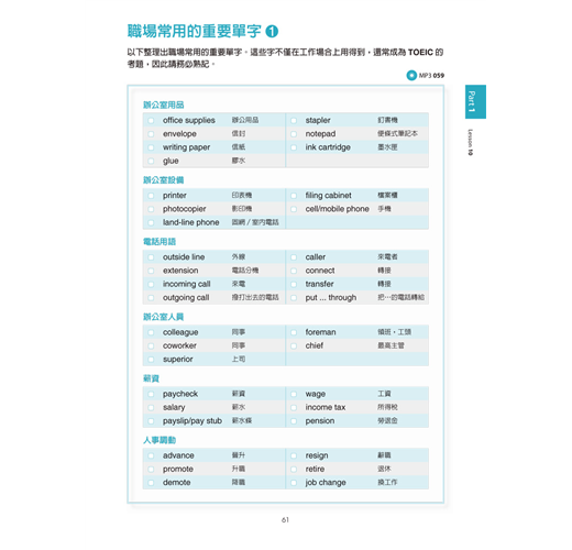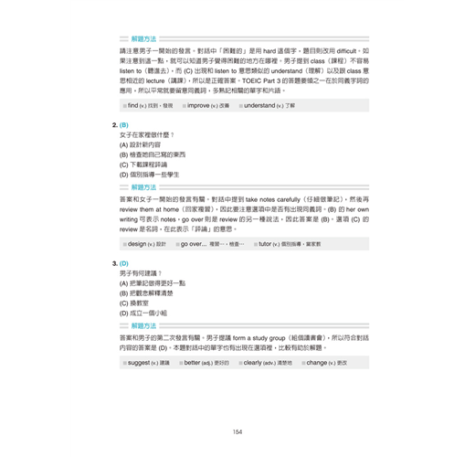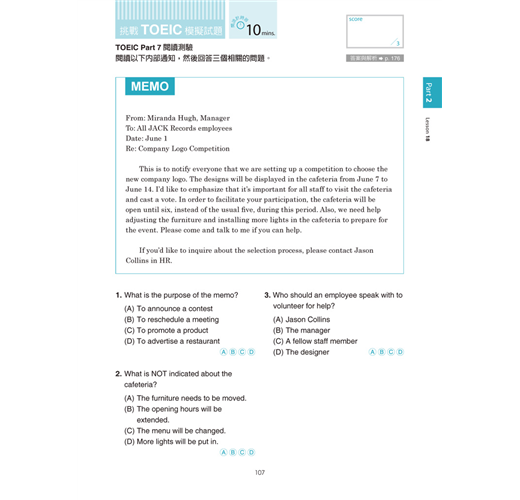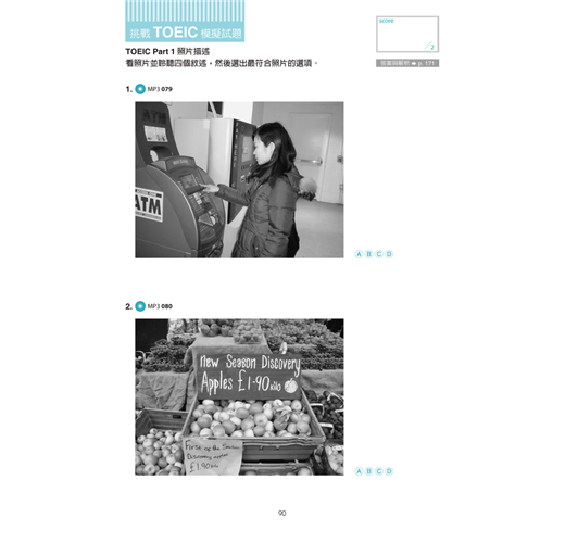 每個單元都有TOEIC模擬試題,一個單元練習一種題型,全書聽力和閱讀模擬試題的比例各半。大家不僅可以藉此習慣TOEIC的出題方式,也能透過題目來驗收之前學到的詞彙。