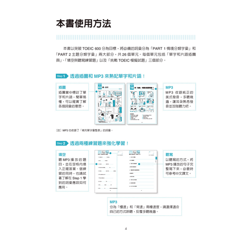 MP3收錄了插圖頁和表格頁中的所有單字。除了閱讀,也要好好運用所附的MP3,在熟記單字的同時,也提升聽力。
