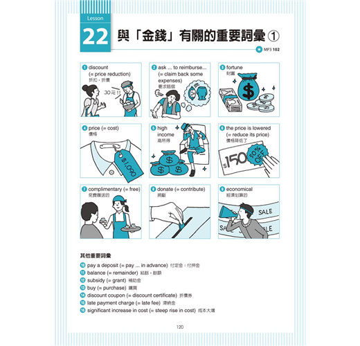 「PART 2主題分類字彙」將詞彙分為「情緒」、「動作」和「金錢」三大類共10個單元。為了讓大家記住這些單字和片語,也搭配了各種插圖。