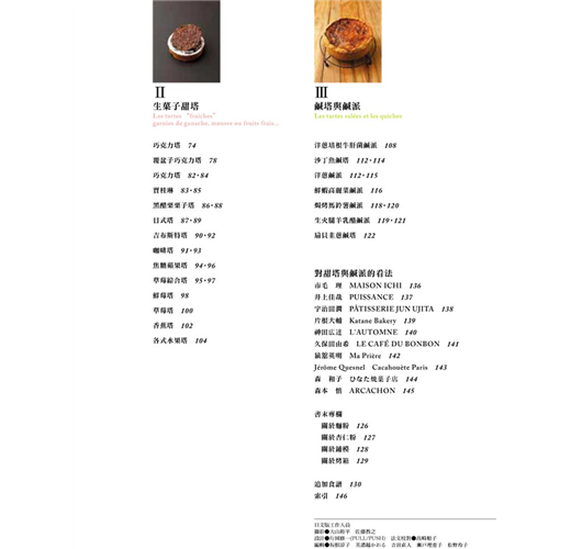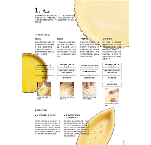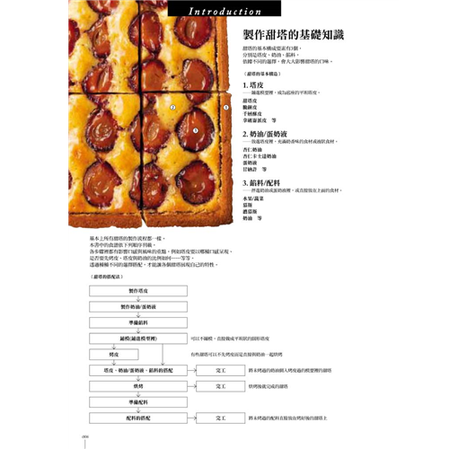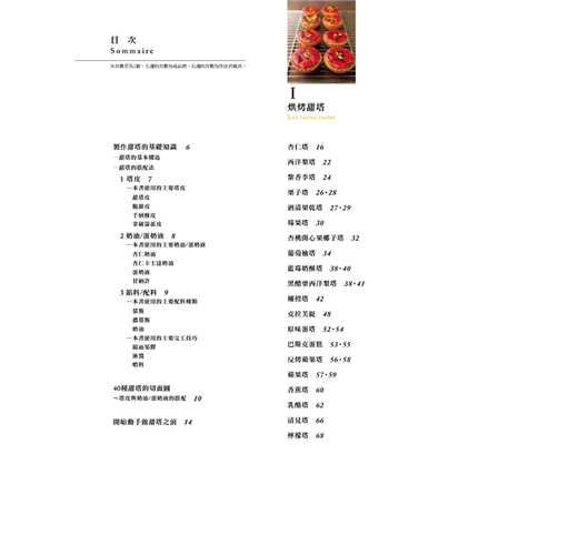 從頭介紹製作甜塔的基本知識、甜塔的基本構造與搭配法,利用全彩照片呈現40種甜塔與鹹派的切面圖,附詳盡的製作解說。