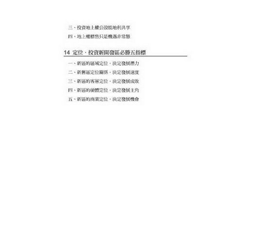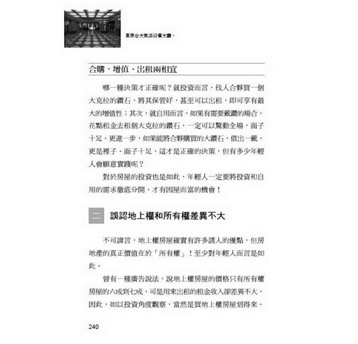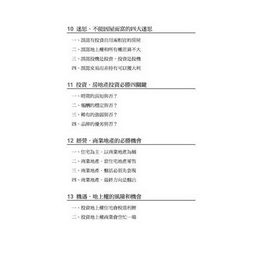 同時提出房地產投資的必勝理論:要採取長期「持有」而非短期「買賣」才能真正獲利;並且依據「格局理論」,建議讀者如果資金不足應將採取合作而非單打獨鬥的方式,才能迅速投入房地產,減少風險並真正獲利。