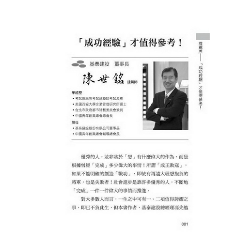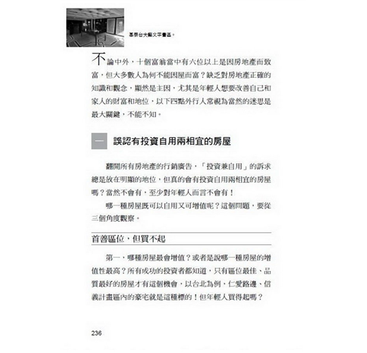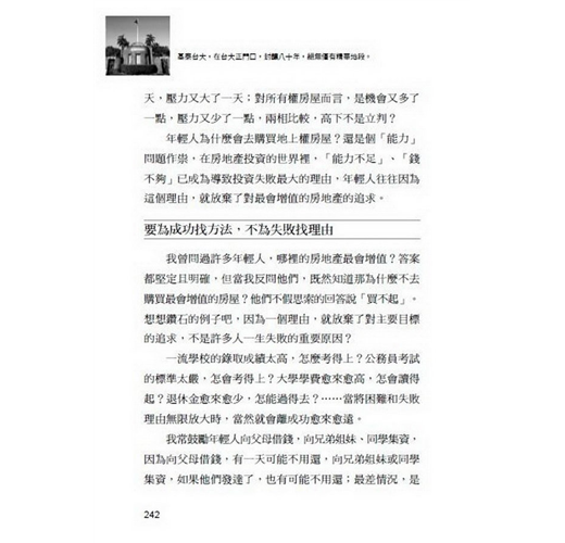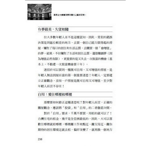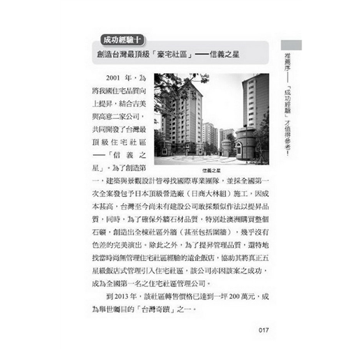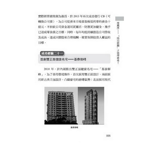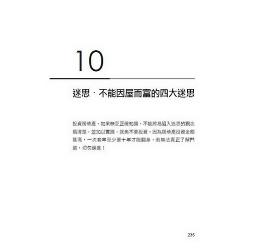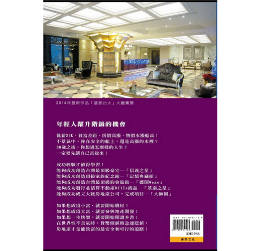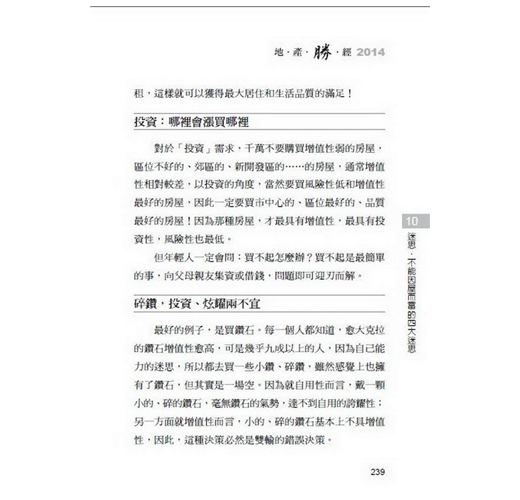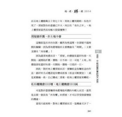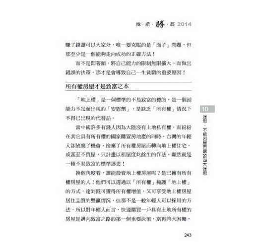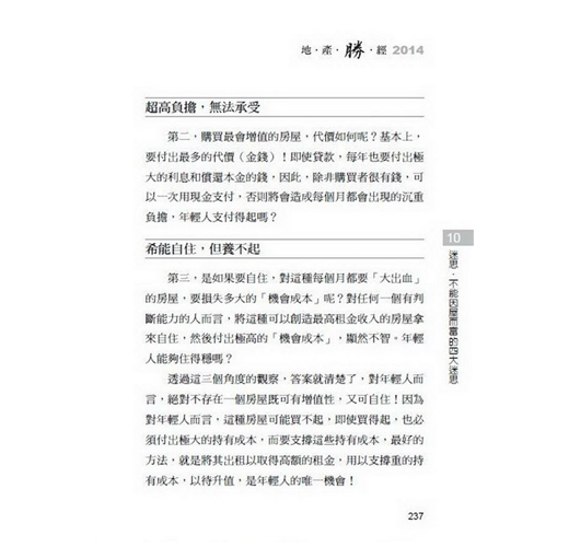 為了協助投資人,尤其是年輕人可以脫貧致富,我從2006年起,即使工作十分忙碌,仍然強迫自己,每年將房地產市場的環境與機會變化整理成《地產勝經》出版,以善盡一個知識份子回饋社會的角色!