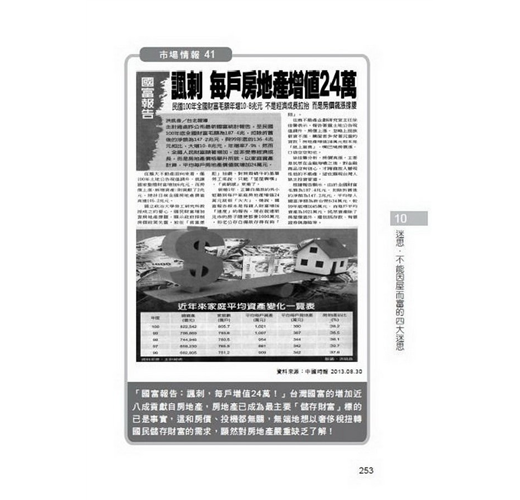 在2007年,當人們瘋狂的搶進總價便宜的小套房與郊區住宅的時候,我於2008年初出版了《地產勝經2008──有錢人購屋必勝秘訣》告訴投資人,要向有錢人學習,買大不買小,買近不買遠,買貴不買廉,才是真正可以獲利的機會。還提醒購屋者,只擁有一幢住宅並不能獲利,只有第二幢房屋才能使自己有獲利機會。