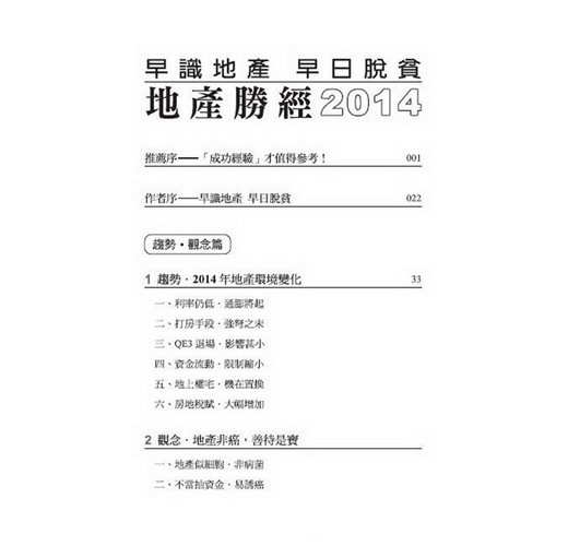 在2013年,政府以打房為名,實則全力歛稅,不但破壞了地產稅制,打擊了房屋市場,傷害了經濟發展,更大幅增加了人民的負擔!尤其是房地產相關稅賦,在人民平均實質薪資倒退16年的情況下,土增稅卻創了14年的新高,地價稅更創歷史新高,在這種變局下,我仍於2014年初出版了《地產勝經2014──早識地產.早日脫貧》,建議大家在世界性經濟已走向復甦道路的時候,要快速了解地產,參與地產,仍是能脫貧致富和提昇社會地位的最重要方向!而在實務上,要注意節稅的知識,要以各種型式減少以個人名義持有地產,並應注意商業地產的發展,以及對海峽兩岸地產投資機會的參與。