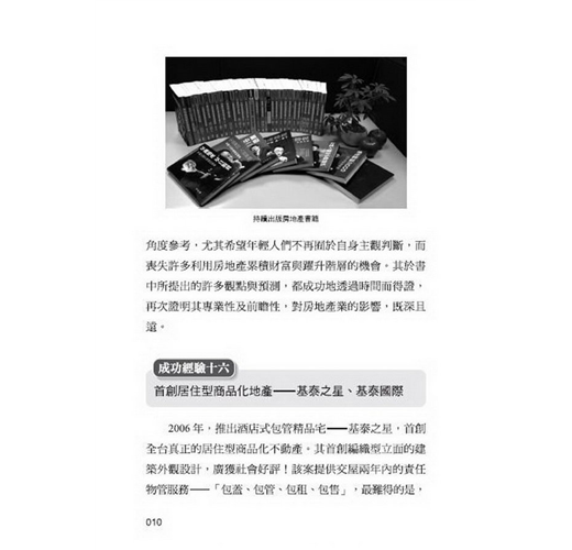 在2009年,當都市精華區土地極為稀有,房價飆漲快速,政府開始選擇性打房,減少對小套房商品放款,並逐步緊縮銀根時,我於2010年初出版了《地產勝經2010──因屋而富.因屋而貴》,告訴投資人由於遺贈稅賦大幅降低,海外游資大量回歸,好宅的需求必然續強!同時預測利率不可能提高,以及房價一定還會漲,但在選擇區位時,一定要注意郊區房屋雖然價格便宜,但卻有不易增值的現象,年輕人千萬不要依自己的能力購屋,而應購買有增值潛力的房屋!並再一次提出「預售屋」價格有多高,就代表「中古屋」的品質有多差,所以千萬不要盲目投資品質不佳的中古與郊區房屋。