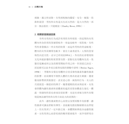 或許有人會懷疑,為何要對這些事情感到狐疑,既然這樣的遊戲規則可以長存於這個社會,古今中外、東西方似乎也都採用,那表示這樣的「兩性模式」是可行的,大家何樂而不為呢?但仔細想想,現代的兩性模式早已和古代的兩性模式不相一致了。古早的世代,在我們的阿嬤出門都還需要戴上手套和帽子的年代,在媽媽只能在家煮飯洗碗帶小孩的年代,在爸爸不能進廚房的年代,那時的阿公阿嬤們有辦法想像爸爸很會煮飯,媽媽很會賺錢的家庭嗎?你可能會說:「對啊,時代在演變,以前太老古板了。」在我的成長環境中,我的爸爸是個不會煮飯,但很會帶小孩的好爸爸,因為我的媽媽是事業女強人,每天忙著賺錢,除了煮飯,沒有太多的時間照顧我們的生活。我和哥哥一旦生病,或是有學校的事情要處理,必定二話不說找爸爸。此外,爸爸雖然不會煮飯,但他逐漸包辦整個家的家務事,因為媽媽賺錢辛苦,沒有多餘的體力和心力做家事,所以即便爸爸自己也有工作,但也可說是身兼家務的新時代家庭主夫。我的父母親對於家庭的概念,已經從早期的「男主外女主內」轉變為現代的「分工合作」,我想這樣的模式在現今小家庭中極為常見。由此可看出,性別和兩性的定義會隨著時代而變遷,沒有絕對的定義,只有時代的反映。有人預測,未來的「男生」不會再那麼「男生」,未來的「女生」也不會再那麼「女生」,兩性的界限將會逐漸模糊,我們可能會愈來愈「中性」。雖然沒有人知道最終會如何,但我堅信,這本書可以提供一個解析未來性別的思考邏輯,也能提供將來性別脈動的走向預測。